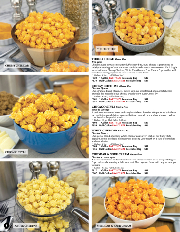 Our signature blend of kernels, mixed with our secret blend of gourmet cheeses provides the most delicious cheesy cheddar corn ever! A must try!